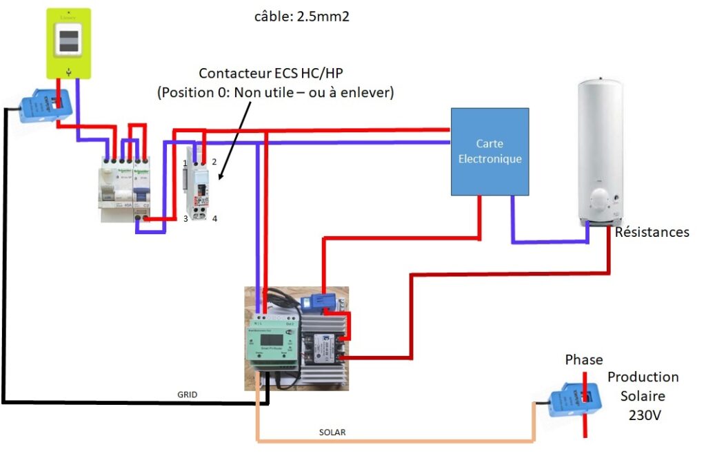 En résumé, le SSR (relais électronique) du routeur doit donc être intercalée entre la sortie de la carte électronique (connecteur blanc d’où sortent 5 fils) et les résistances du chauffe-eau.Smart PV-Router