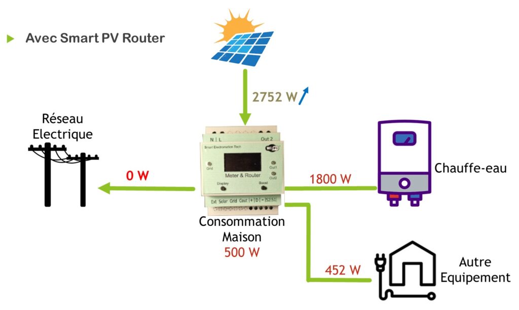 Connectée au Smart PV-Router, celui la pilote en cohérence avec votre chauffe-eau électrique et avec une gestion des heures creuses.