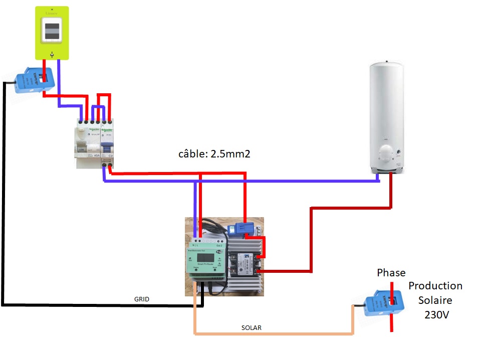 Il est fourni avec un relais statique SSR et son support rail DIN ainsi de 2 pinces ampèremétriques (une pour le compteur principal « grid » et une autre pour mesurer la puissance en sortie du routeur « cout »).